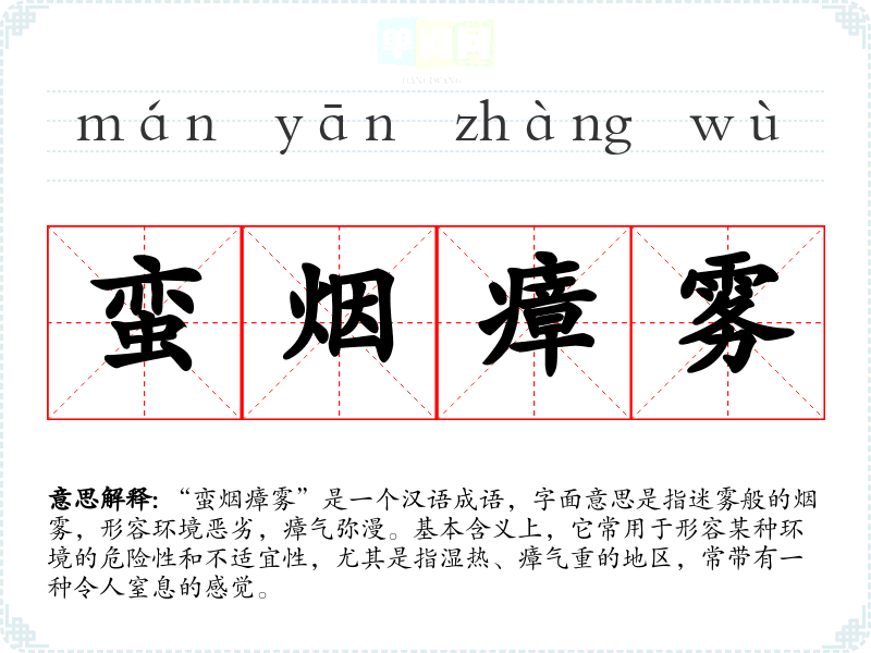 “蛮烟瘴雾”是一个汉语成语,字面意思是指迷雾般的烟雾,形容环境恶劣,瘴气弥漫。基本含义上,它常用于形容某种环境的危险性和不适宜性,尤其是指湿热、瘴气重的地区,常带有一种令人窒息的感觉。