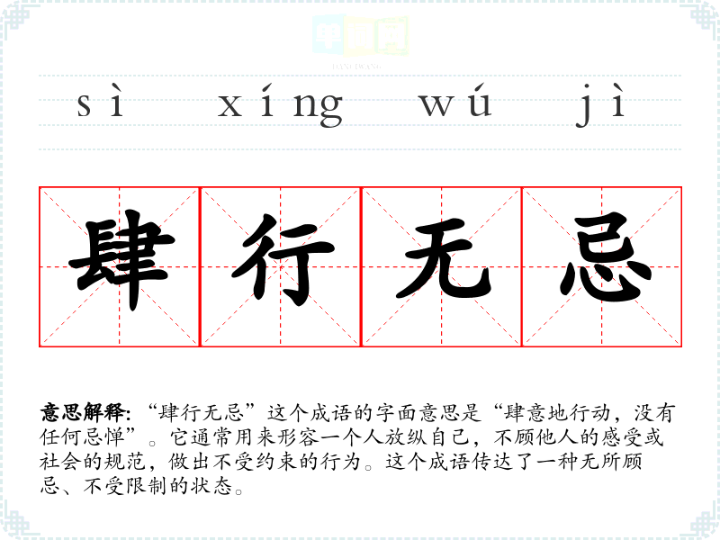 “肆行无忌”这个成语的字面意思是“肆意地行动,没有任何忌惮”。它通常用来形容一个人放纵自己,不顾他人的感受或社会的规范,做出不受约束的行为。这个成语传达了一种无所顾忌、不受限制的状态。