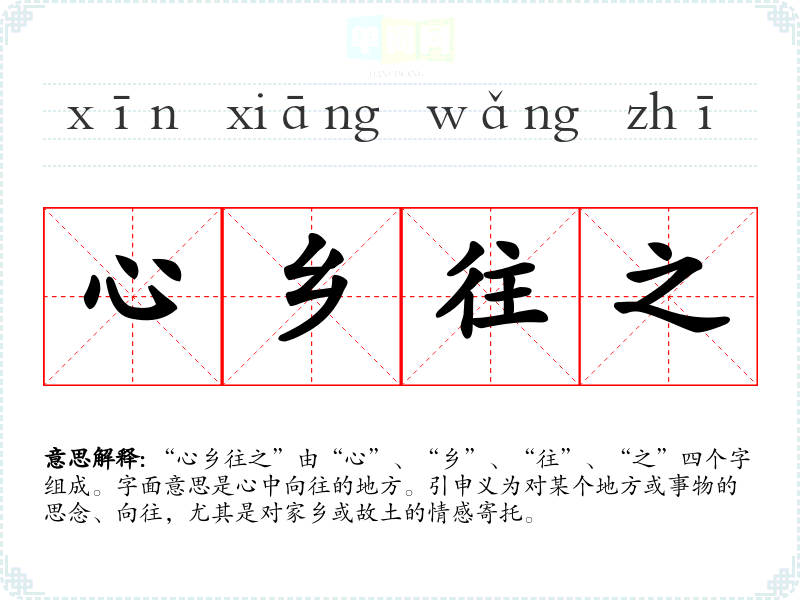 “心乡往之”由“心”、“乡”、“往”、“之”四个字组成。字面意思是心中向往的地方。引申义为对某个地方或事物的思念、向往,尤其是对家乡或故土的情感寄托。