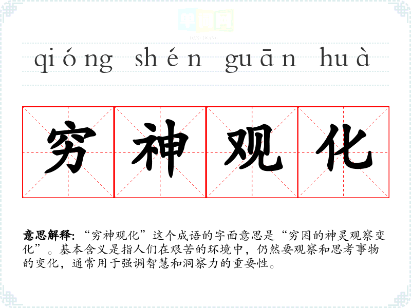 “穷神观化”这个成语的字面意思是“穷困的神灵观察变化”。基本含义是指人们在艰苦的环境中,仍然要观察和思考事物的变化,通常用于强调智慧和洞察力的重要性。
