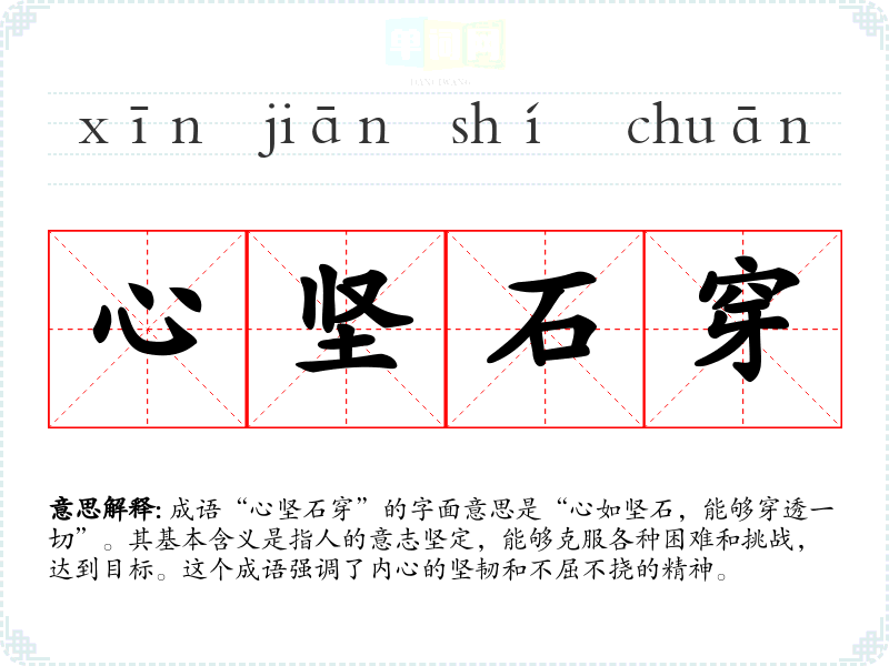 成语“心坚石穿”的字面意思是“心如坚石,能够穿透一切”。其基本含义是指人的意志坚定,能够克服各种困难和挑战,达到目标。这个成语强调了内心的坚韧和不屈不挠的精神。