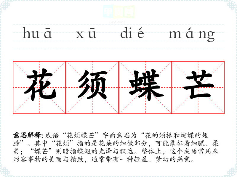 成语“花须蝶芒”字面意思为“花的须根和蝴蝶的翅膀”。其中“花须”指的是花朵的细微部分,可能象征着细腻、柔美;“蝶芒”则暗指蝶翅的光泽与飘逸。整体上,这个成语常用来形容事物的美丽与精致,通常带有一种轻盈、梦幻的感觉。