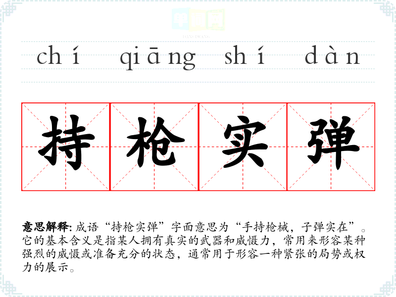 成语“持枪实弹”字面意思为“手持枪械,子弹实在”。它的基本含义是指某人拥有真实的武器和威慑力,常用来形容某种强烈的威慑或准备充分的状态,通常用于形容一种紧张的局势或权力的展示。
