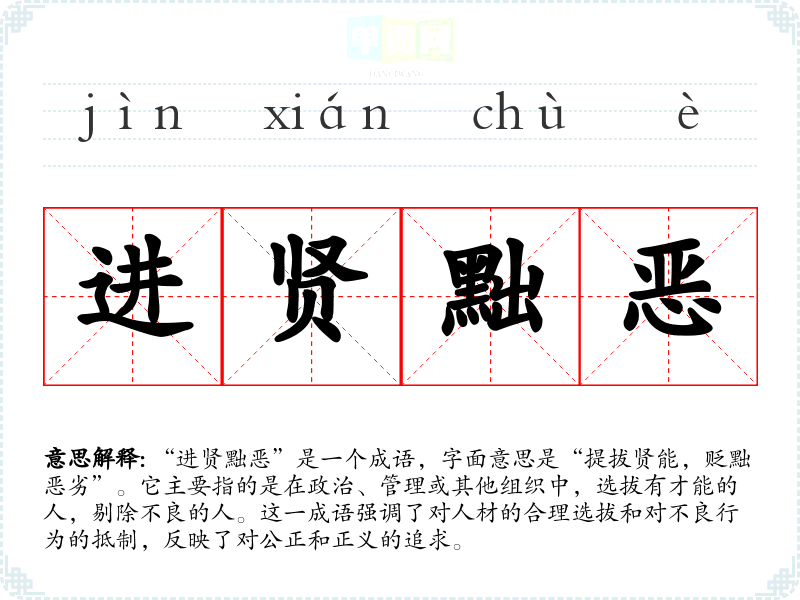 “进贤黜恶”在**传统文化中有着深厚的根基,尤其是在儒家思想中,强调道德修养和贤能治国的重要性。在现代社会,这一成语仍然具有重要的现实意义,尤其在企业管理、政治治理和社会组织中,强调通过合理的选拔机制来提升整体效能和道德水平。