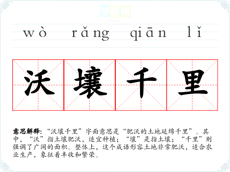 “沃壤千里”字面意思是“肥沃的土地延绵千里”。其中,“沃”指土壤肥沃,适宜种植;“壤”是指土壤;“千里”则强调了广阔的面积。整体上,这个成语形容土地非常肥沃,适合农业生产,象征着丰收和繁荣。