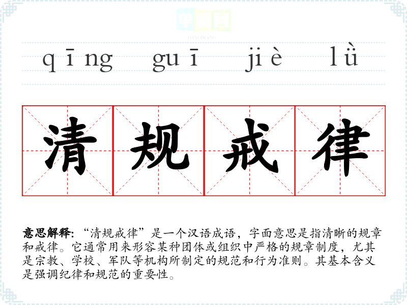 “清规戒律”是一个汉语成语,字面意思是指清晰的规章和戒律。它通常用来形容某种团体或组织中严格的规章制度,尤其是**、学校、军队等机构所制定的规范和行为准则。其基本含义是强调纪律和规范的重要性。
