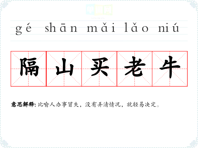 | 隔山买老牛 | 比喻人办事冒失,没有弄清情况,就轻易决定。 |