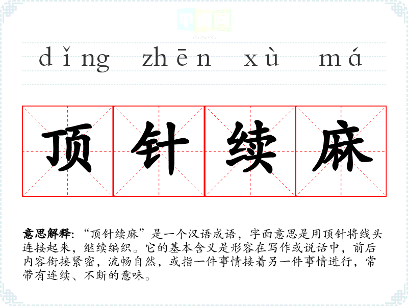 “顶针续麻”是一个汉语成语,字面意思是用顶针将线头连接起来,继续编织。它的基本含义是形容在写作或说话中,前后内容衔接紧密,流畅自然,或指一件事情接着另一件事情进行,常带有连续、不断的意味。