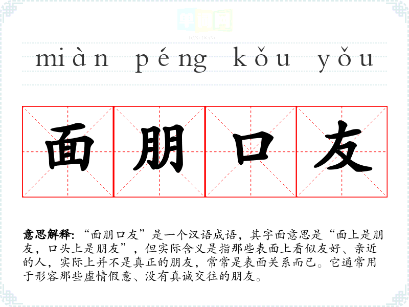 “面朋口友”是一个汉语成语,其字面意思是“面上是朋友,口头上是朋友”,但实际含义是指那些表面上看似友好、亲近的人,实际上并不是真正的朋友,常常是表面关系而已。它通常用于形容那些虚情假意、没有真诚交往的朋友。