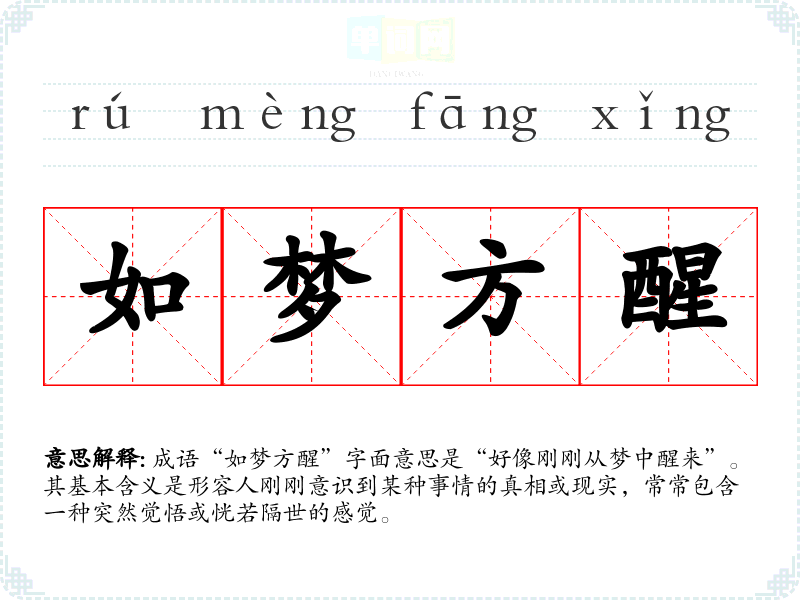 成语“如梦方醒”字面意思是“好像刚刚从梦中醒来”。其基本含义是形容人刚刚意识到某种事情的真相或现实,常常包含一种突然觉悟或恍若隔世的感觉。