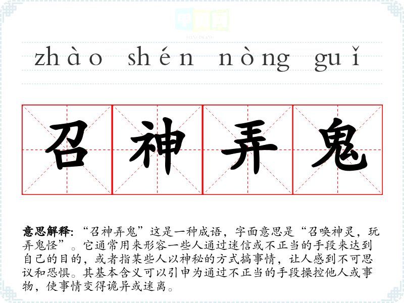 “召神弄鬼”这是一种成语,字面意思是“召唤神灵,玩弄鬼怪”。它通常用来形容一些人通过迷信或不正当的手段来达到自己的目的,或者指某些人以神秘的方式搞事情,让人感到不可思议和恐惧。其基本含义可以引申为通过不正当的手段操控他人或事物,使事情变得诡异或迷离。