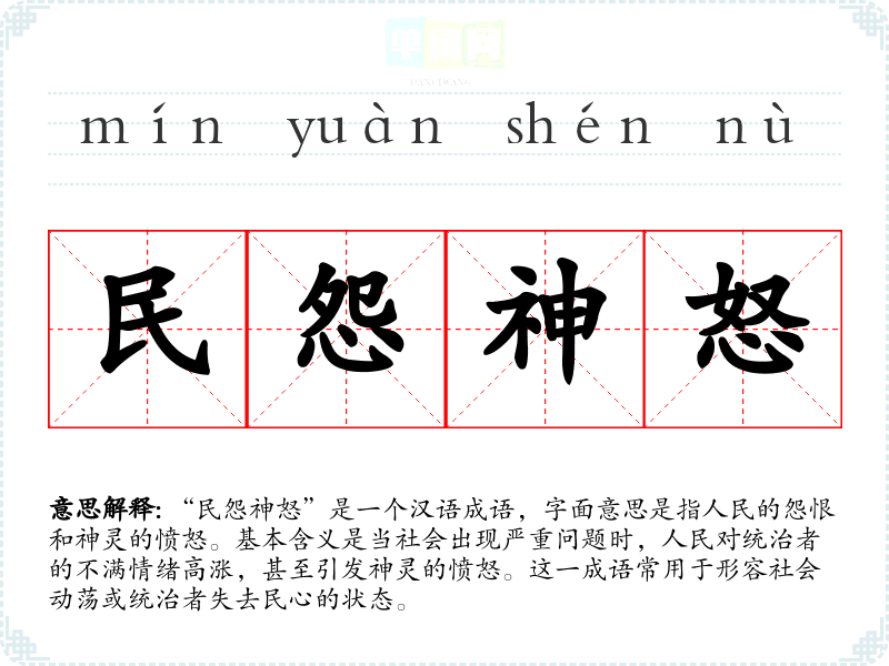 | 民怨神怒 | 百姓怨恨,天神愤怒。形容作恶太甚,引进极大愤怒。 |