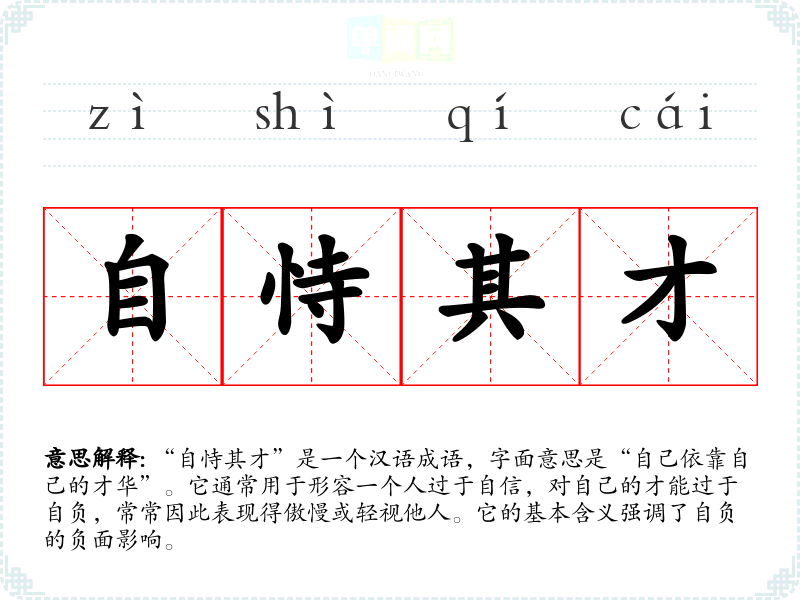 “自恃其才”是一个汉语成语,字面意思是“自己依靠自己的才华”。它通常用于形容一个人过于自信,对自己的才能过于自负,常常因此表现得傲慢或轻视他人。它的基本含义强调了自负的负面影响。