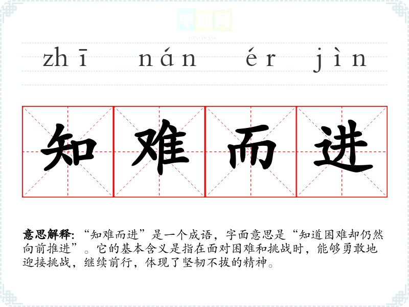 “知难而进”出自《尚书》,原文描述了一种在艰难环境中不畏困难、努力进取的精神。该成语强调了勇气与智慧的结合,意在鼓励人们在面对困境时,不应该退缩,而是要敢于迎接挑战。