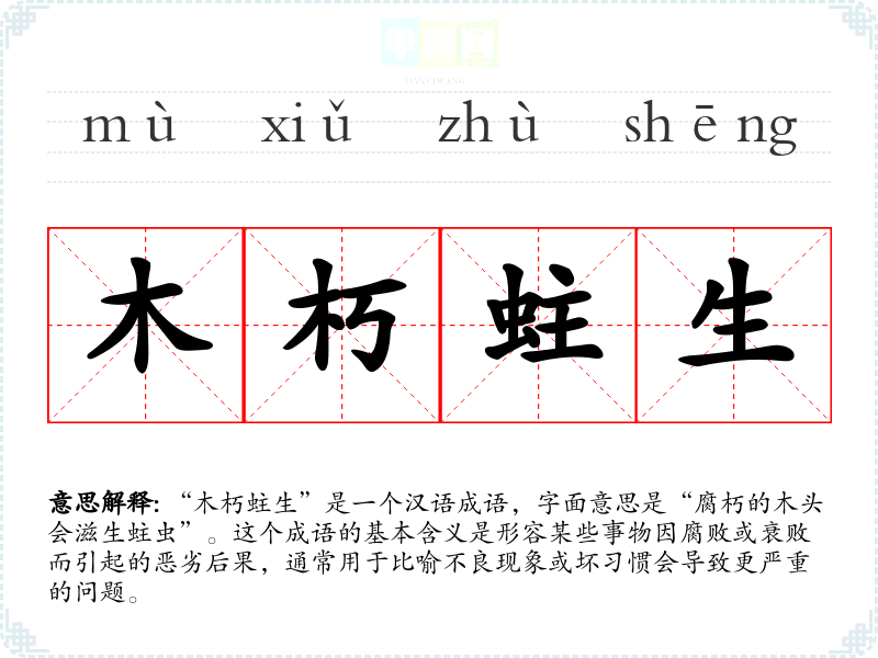“木朽蛀生”出自《左传》,在《左传·僖公二十九年》中提到,腐朽的木材容易被虫蛀。这个成语强调了潜在的腐败和危害,暗示着如果不及时处理某些问题,后果将会更加严重。