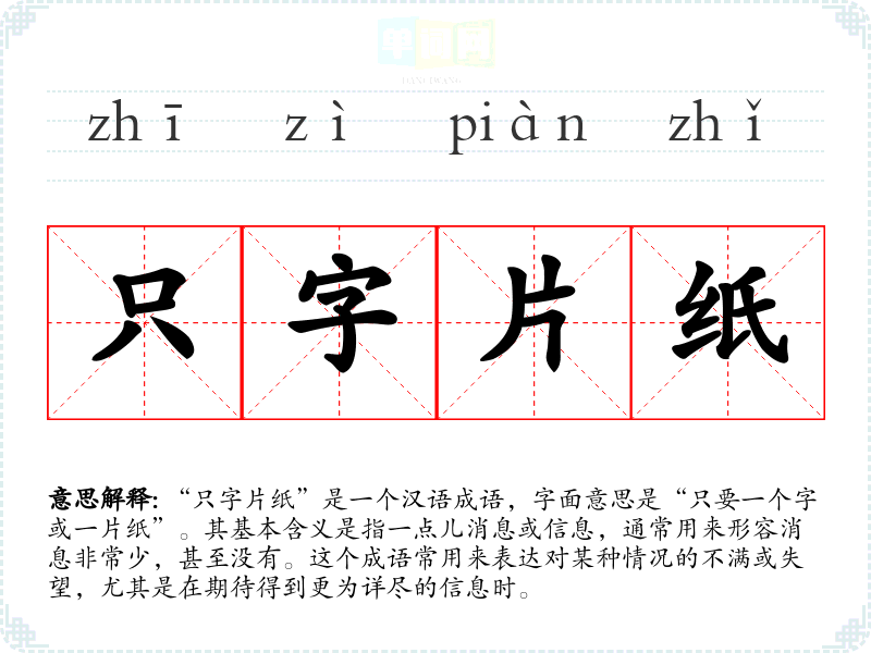 “只字片纸”是一个汉语成语,字面意思是“只要一个字或一片纸”。其基本含义是指一点儿消息或信息,通常用来形容消息非常少,甚至没有。这个成语常用来表达对某种情况的不满或失望,尤其是在期待得到更为详尽的信息时。