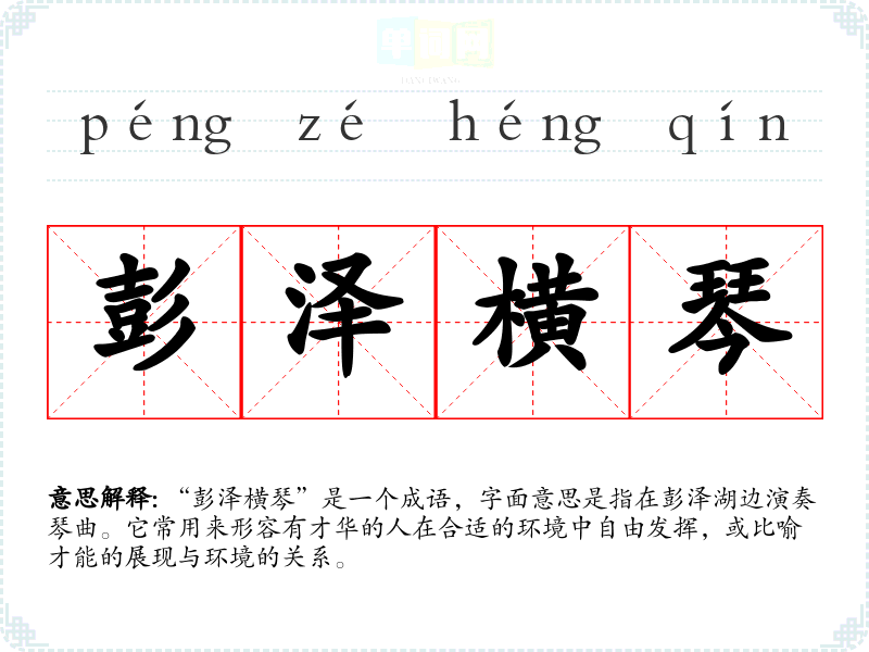 “彭泽横琴”是一个成语,字面意思是指在彭泽湖边演奏琴曲。它常用来形容有才华的人在合适的环境中自由发挥,或比喻才能的展现与环境的关系。
