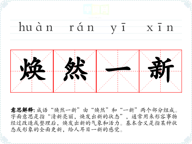 成语“焕然一新”由“焕然”和“一新”两个部分组成。字面意思是指“清新亮丽,焕发出新的状态”,通常用来形容事物经过改造或整理后,焕发出新的气象和活力。基本含义是指某种状态或形象的全面更新,给人耳目一新的感觉。