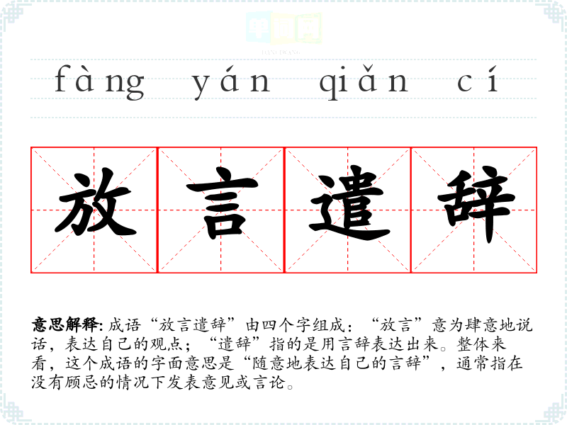 成语“放言遣辞”由四个字组成:“放言”意为肆意地说话,表达自己的观点;“遣辞”指的是用言辞表达出来。整体来看,这个成语的字面意思是“随意地表达自己的言辞”,通常指在没有顾忌的情况下发表意见或言论。