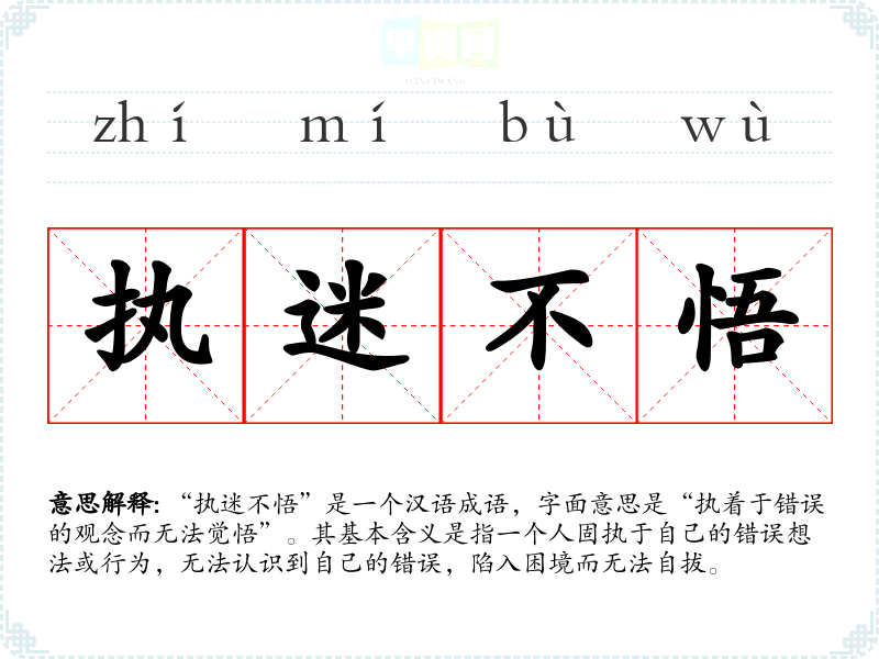 “执迷不悟”是一个汉语成语,字面意思是“执着于错误的观念而无法觉悟”。其基本含义是指一个人固执于自己的错误想法或行为,无法认识到自己的错误,陷入困境而无法自拔。