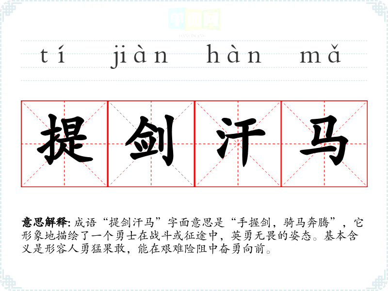 成语“提剑汗马”字面意思是“手握剑,骑马奔腾”,它形象地描绘了一个勇士在战斗或征途中,英勇无畏的姿态。基本含义是形容人勇猛果敢,能在艰难险阻中奋勇向前。