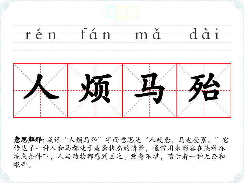 - 反义成语:轻松自在、游刃有余。与“人烦马殆”相对,这些成语描述的是一种轻松愉快、毫无压力的状态。