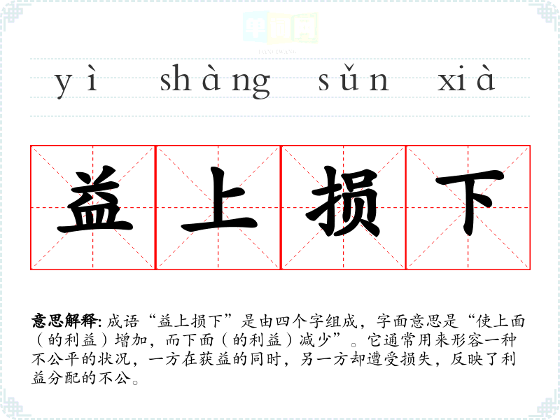 成语“益上损下”是由四个字组成,字面意思是“使上面(的利益)增加,而下面(的利益)减少”。它通常用来形容一种不公平的状况,一方在获益的同时,另一方却遭受损失,反映了利益分配的不公。