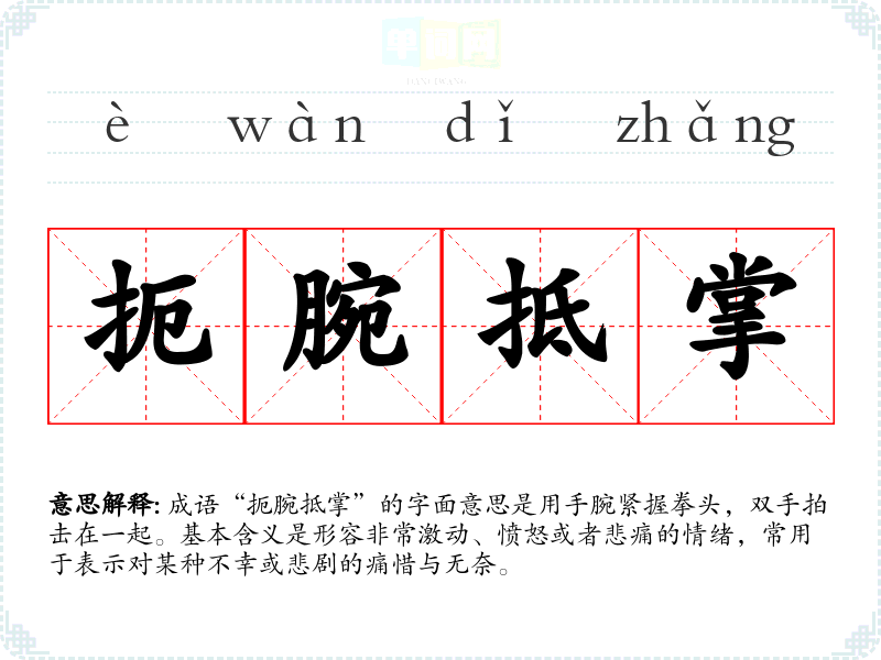 成语“扼腕抵掌”的字面意思是用手腕紧握拳头,双手拍击在一起。基本含义是形容非常激动、愤怒或者悲痛的情绪,常用于表示对某种不幸或悲剧的痛惜与无奈。