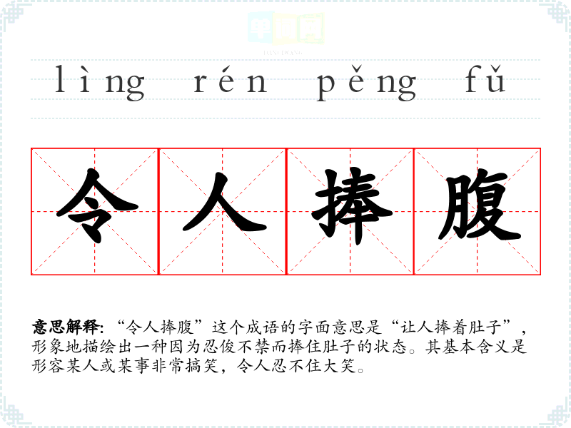 “令人捧腹”这个成语的字面意思是“让人捧着肚子”,形象地描绘出一种因为忍俊不禁而捧住肚子的状态。其基本含义是形容某人或某事非常搞笑,令人忍不住大笑。
