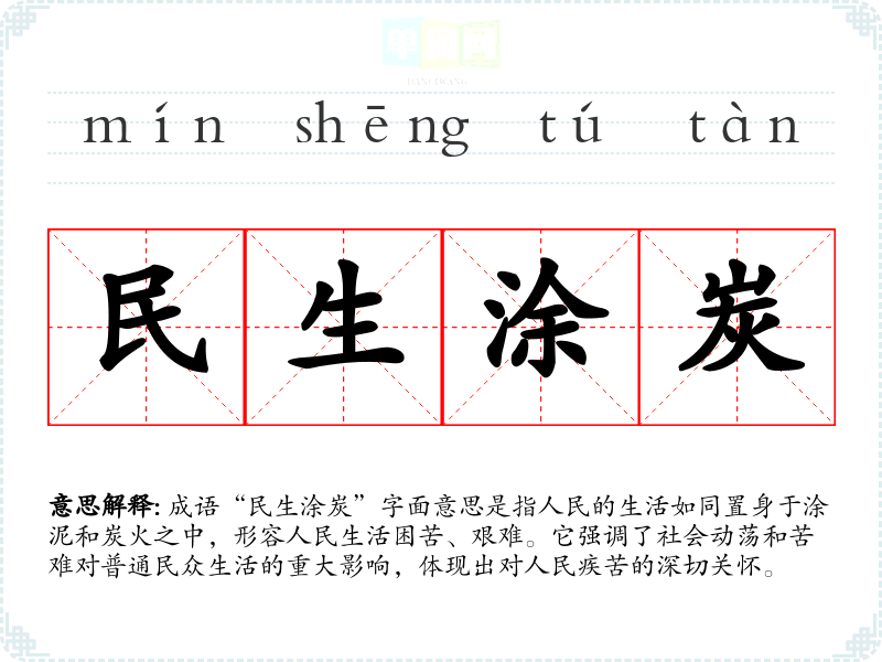 成语“民生涂炭”字面意思是指人民的生活如同置身于涂泥和炭火之中,形容人民生活困苦、艰难。它强调了社会动荡和苦难对普通民众生活的重大影响,体现出对人民疾苦的深切关怀。