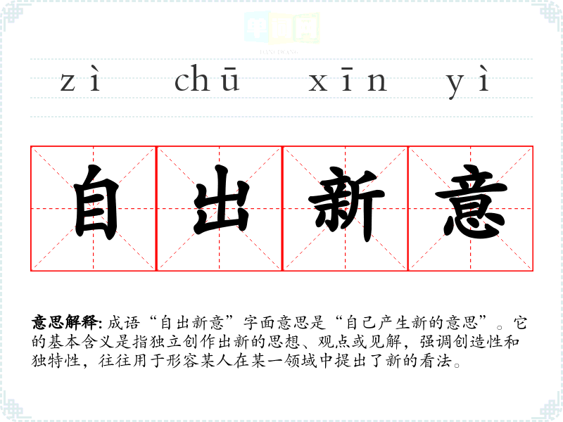 成语“自出新意”字面意思是“自己产生新的意思”。它的基本含义是指独立创作出新的思想、观点或见解,强调创造性和独特性,往往用于形容某人在某一领域中提出了新的看法。