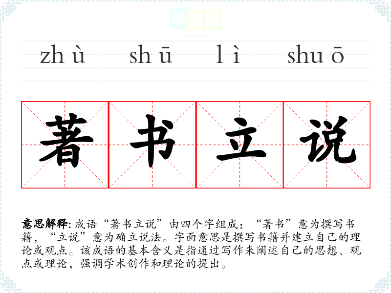 成语“著书立说”由四个字组成:“著书”意为撰写书籍,“立说”意为确立说法。字面意思是撰写书籍并建立自己的理论或观点。该成语的基本含义是指通过写作来阐述自己的思想、观点或理论,强调学术创作和理论的提出。