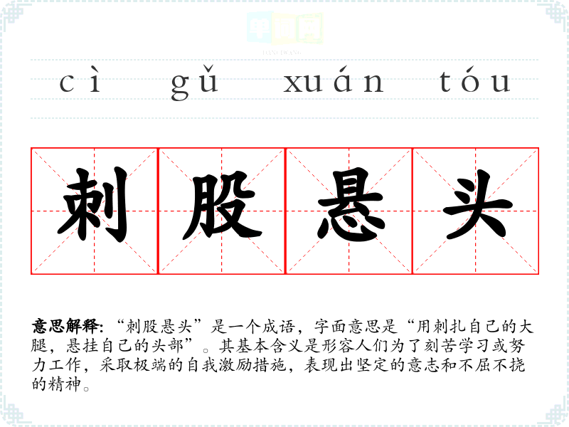 | 刺股悬头 | 形容刻苦学习。同“刺股悬梁”。 |