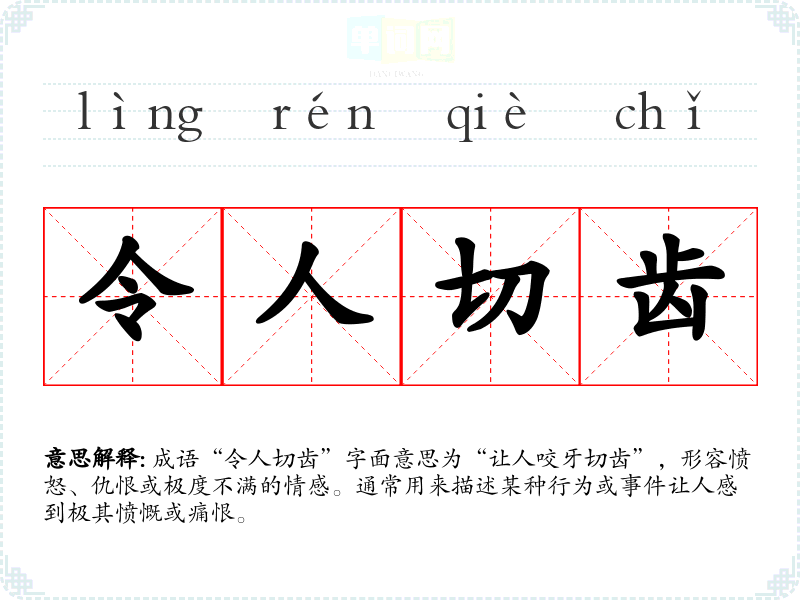 成语“令人切齿”字面意思为“让人咬牙切齿”,形容愤怒、仇恨或极度不满的情感。通常用来描述某种行为或**让人感到极其愤慨或痛恨。