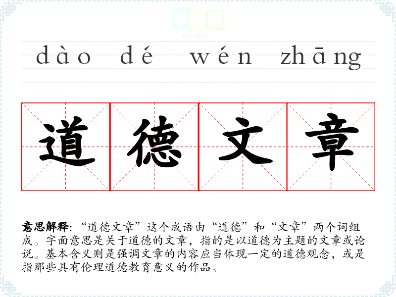 “道德文章”这个成语由“道德”和“文章”两个词组成。字面意思是关于道德的文章,指的是以道德为主题的文章或论说。基本含义则是强调文章的内容应当体现一定的道德观念,或是指那些具有伦理道德教育意义的作品。