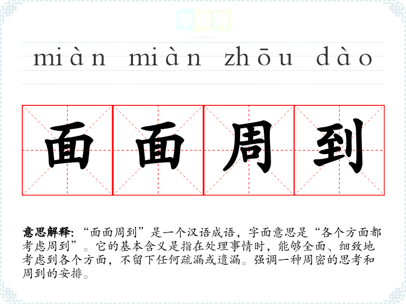 “面面周到”是一个汉语成语,字面意思是“各个方面都考虑周到”。它的基本含义是指在处理事情时,能够全面、细致地考虑到各个方面,不留下任何疏漏或遗漏。强调一种周密的思考和周到的安排。