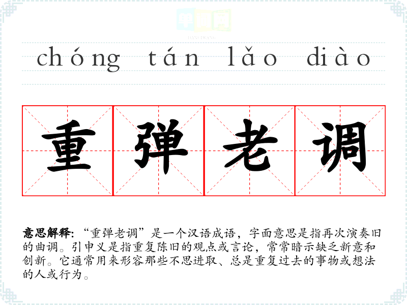“重弹老调”是一个汉语成语,字面意思是指再次演奏旧的曲调。引申义是指重复陈旧的观点或言论,常常暗示缺乏新意和创新。它通常用来形容那些不思进取、总是重复过去的事物或想法的人或行为。