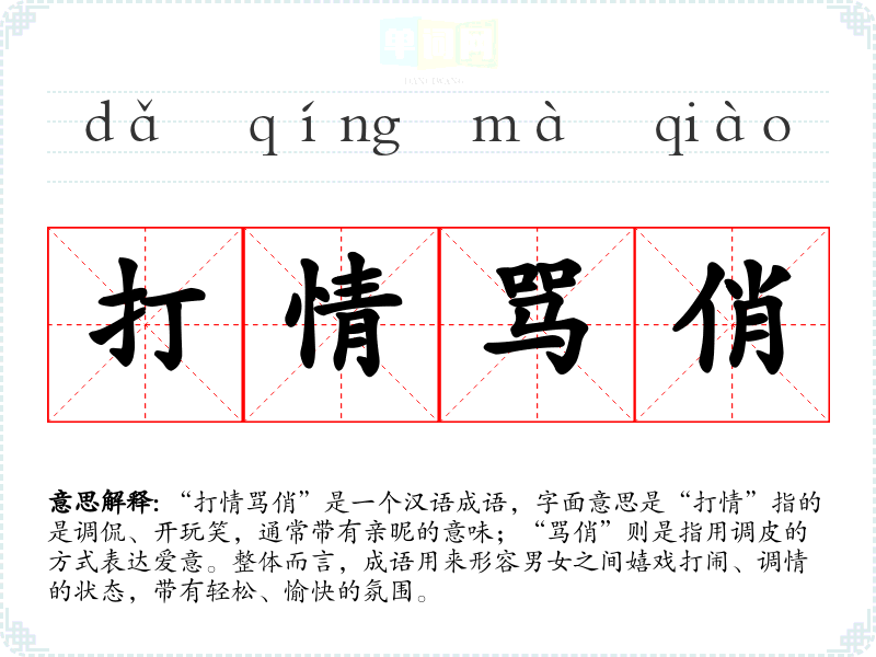 “打情骂俏”是一个汉语成语,字面意思是“打情”指的是调侃、开玩笑,通常带有亲昵的意味;“骂俏”则是指用调皮的方式表达爱意。整体而言,成语用来形容男女之间嬉戏打闹、调情的状态,带有轻松、愉快的氛围。