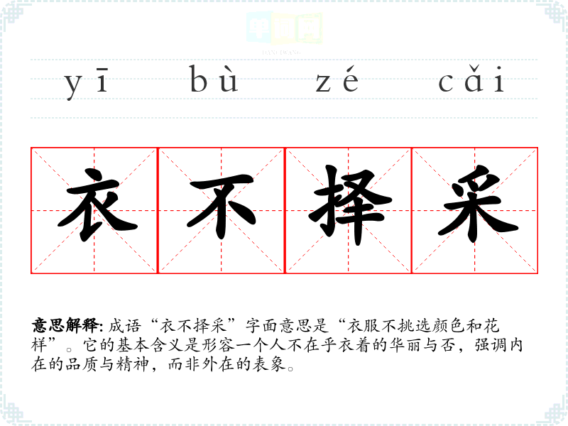 成语“衣不择采”字面意思是“衣服不挑选颜色和花样”。它的基本含义是形容一个人不在乎衣着的华丽与否,强调内在的品质与精神,而非外在的表象。