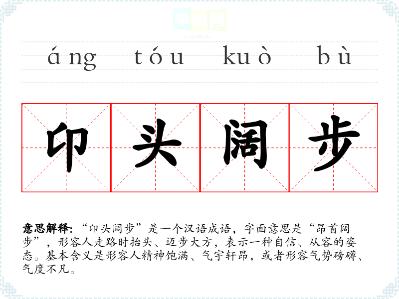 “卬头阔步”是一个汉语成语,字面意思是“昂首阔步”,形容人走路时抬头、迈步大方,表示一种自信、从容的姿态。基本含义是形容人精神饱满、气宇轩昂,或者形容气势磅礴、气度不凡。