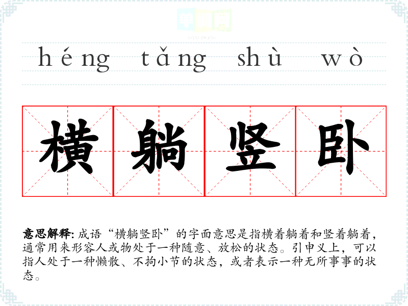 成语“横躺竖卧”的字面意思是指横着躺着和竖着躺着,通常用来形容人或物处于一种随意、放松的状态。引申义上,可以指人处于一种懒散、不拘小节的状态,或者表示一种无所事事的状态。