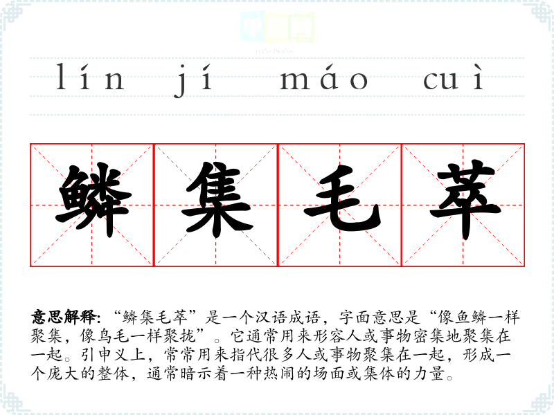 - 反义成语:冷冷清清、寥寥无几。它们则形容人或事物稀少的状态,与“鳞集毛萃”形成鲜明对比。