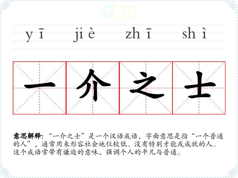 “一介之士”是一个汉语成语,字面意思是指“一个普通的人”,通常用来形容社会地位较低、没有特别才能或成就的人。这个成语常带有谦逊的意味,强调个人的平凡与普通。