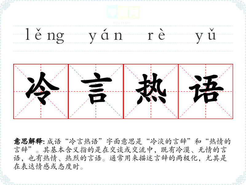成语“冷言热语”字面意思是“冷淡的言辞”和“热情的言辞”。其基本含义指的是在交谈或交流中,既有冷漠、无情的言语,也有热情、热烈的言语。通常用来描述言辞的两极化,尤其是在表达情感或态度时。
