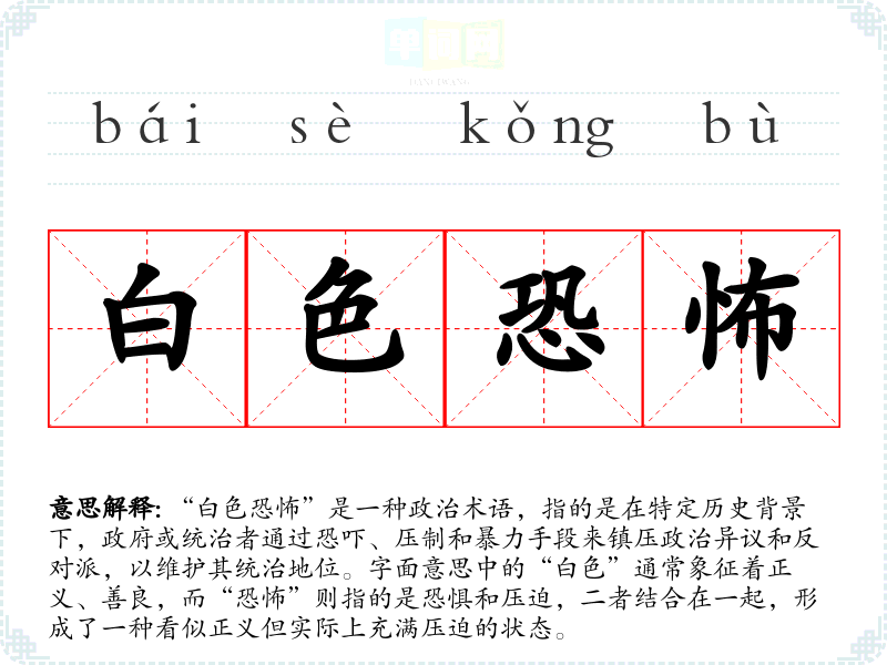 | 白色恐怖 | 白:惨白。指反动派残酷镇压人民的恐怖气氛。 |