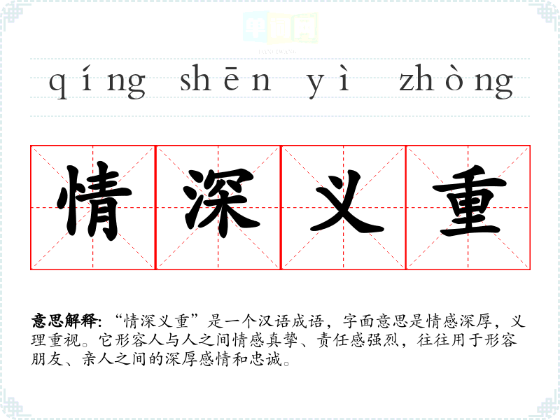 “情深义重”是一个汉语成语,字面意思是情感深厚,义理重视。它形容人与人之间情感真挚、责任感强烈,往往用于形容朋友、亲人之间的深厚感情和忠诚。