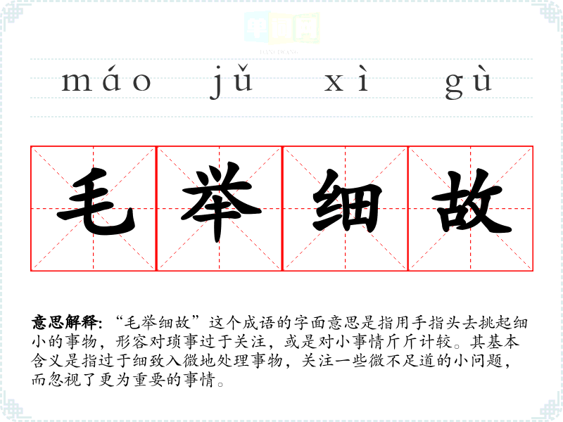 “毛举细故”这个成语的字面意思是指用手指头去挑起细小的事物,形容对琐事过于关注,或是对小事情斤斤计较。其基本含义是指过于细致入微地处理事物,关注一些微不足道的小问题,而忽视了更为重要的事情。