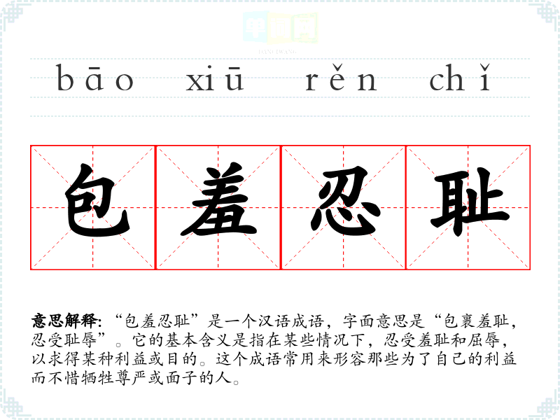 | 包羞忍耻 | 包:包容,藏;忍:容忍,忍耐。容忍羞愧与耻辱。 |
