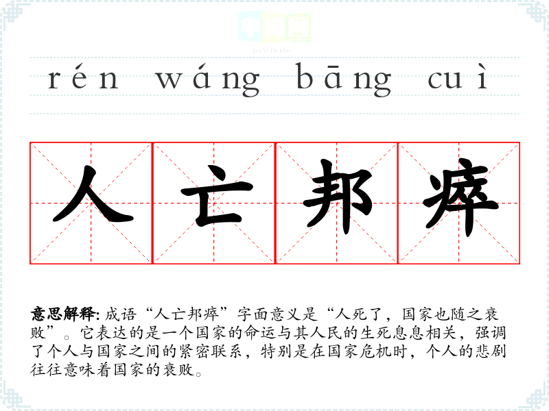 成语“人亡邦瘁”字面意义是“人死了,国家也随之衰败”。它表达的是一个国家的命运与其人民的生死息息相关,强调了个人与国家之间的紧密联系,特别是在国家危机时,个人的悲剧往往意味着国家的衰败。