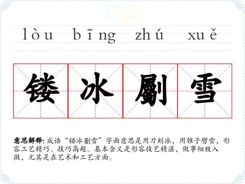 成语“镂冰劚雪”字面意思是用刀刻冰,用锥子劈雪,形容工艺精巧、技巧高超。基本含义是形容技艺精湛,做事细致入微,尤其是在艺术和工艺方面。